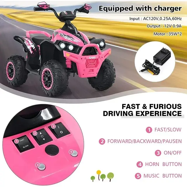 • SLOW START IS SAFER: The ATV 12V seat has a one-button start function which includes high and low speed. Kids can start at a slow speed when starting a super simple operation, so that children drive more safely. In addition, four large diameter wheels increase the stability of the ATV.