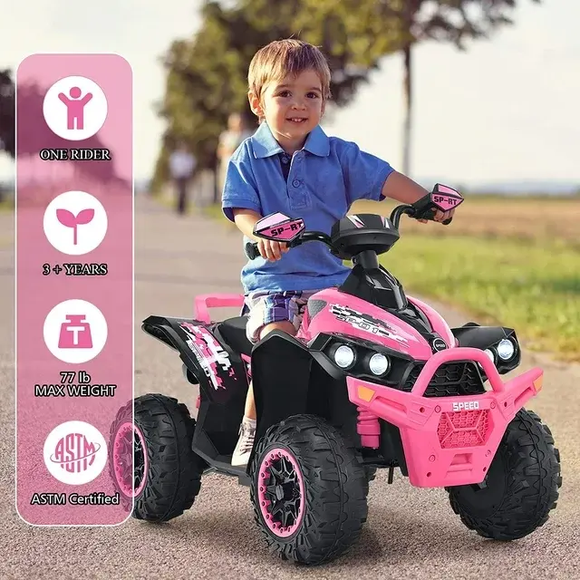 • SAFE & DURABLE MATERISLS: Our children's FOUR-wheel drive ATV is made of new PP and iron materials. It is suitable for children over 3 years old and can withstand a maximum weight of 77 pounds. It can run for 1-2 hours after charging for 8-12 hours. Also through ASTM, CPSIA certification. Parents can safely let their children ride.