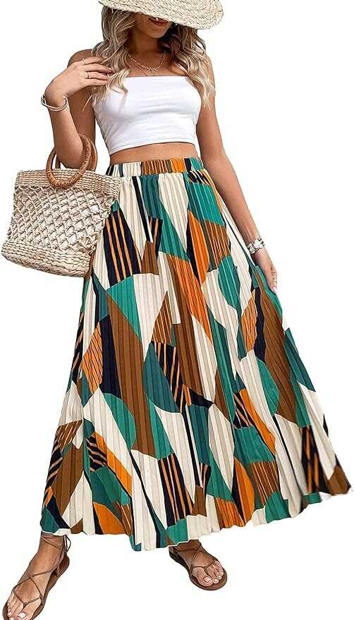 • Design: Geo print, elastic wasit, pleated skirt, maxi skirt, boho style