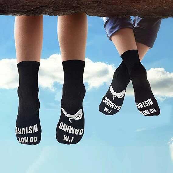 • FUNNY AND GREAT QUALITY - Funny Gamer Socks with non slip design. Socks with saying "do not disturb, I'm gaming" at the bottom. Moisture wicking, smell free, machine washable with similar colors, hold up well in the laundry bag. The back ankle is higher/longer for pulling up and not slipping away from the heel. socks text on the bottom provided nice traction without being so thick as to interfere with wearing footwear.