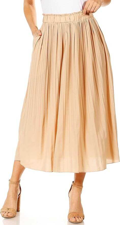 STYLE - Featuring a high waisted fit, chic pleated style and 2 side pockets, the midi skirt is the ideal piece your closet needs. The elastic waistband gives great stretch, and the in seam side pockets are great for carrying small items. The aline style falls to an elegant hem that hits at midcalf length.