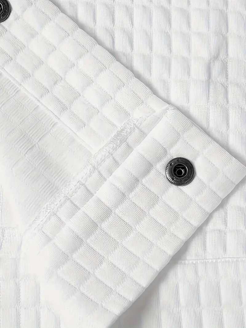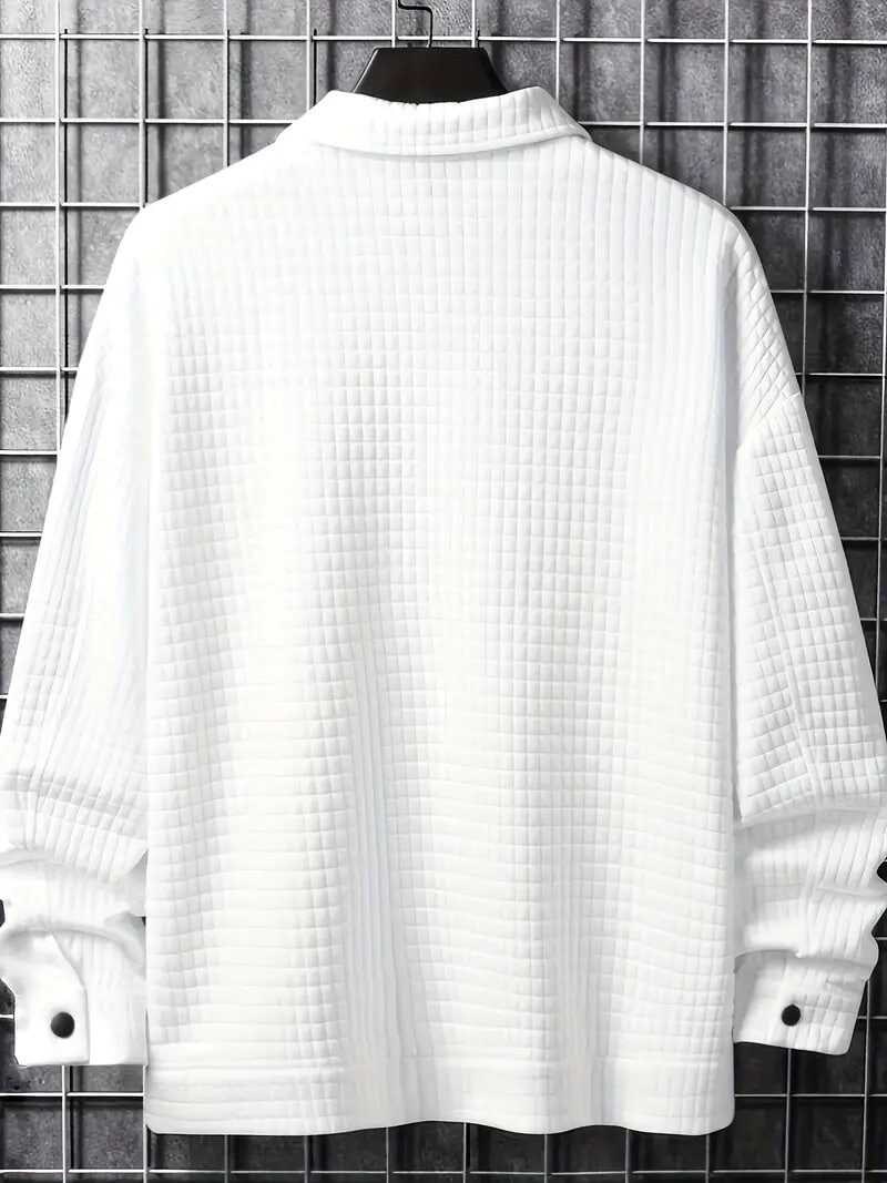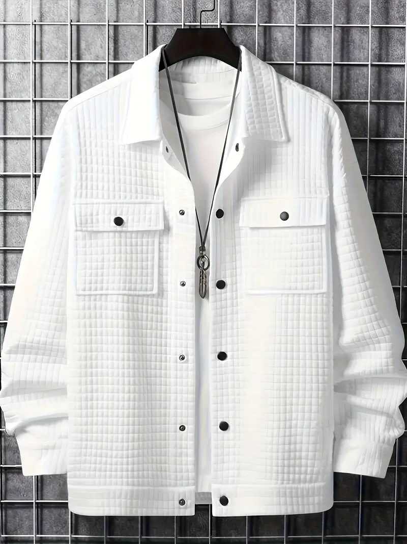 Plus Size Men's Casual Waffle Shirt, Spring Fall Solid Cargo Shirt With Pockets, Men's Clothing