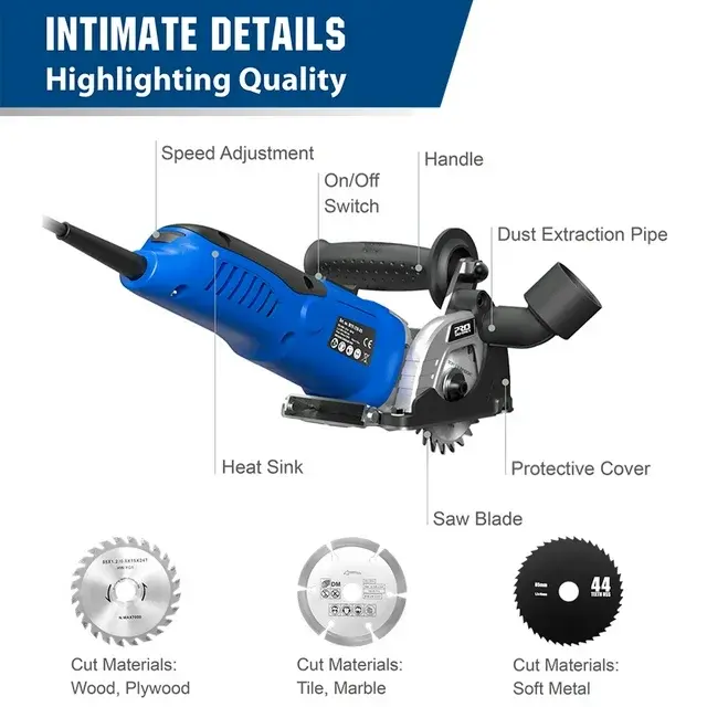 • [Package Contents] -1 x Mini Circular Saw, 1 x 24T TCT Blade, 1 x 44T HSS Blade, 1 x Diamond Blade,  1 x Hex Wrench, 1 x Scale Ruler, 1 x Dust Exhaust Pipe, 1 x User Manual and a Storage Bag for easy carrying.