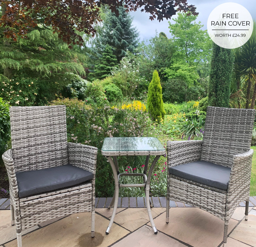 Designed for maximum style and comfort, this exquisite bistro set has 5cm thick cushions, seats 2 people and is sure to be the perfect centrepiece for any garden tea party. Transform your garden into a private paradise and be the envy of all your friends with this premium seating set. The easy-to-assemble flat-pack furniture enables you to relax outside with a drink in little to no time.