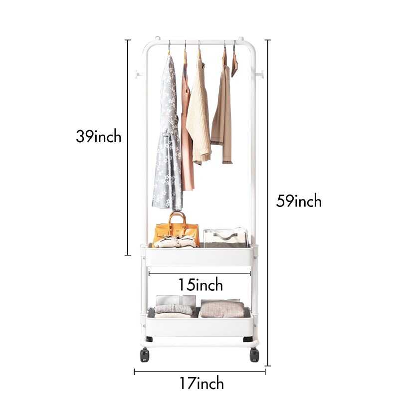 Rolling Garment Rack on Wheels, Entryway Clothing Rack with 2 Tier Metal Basket