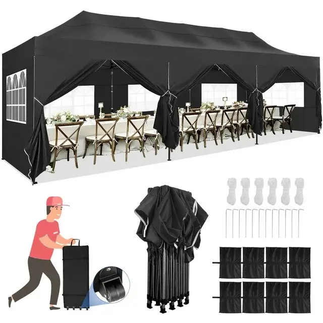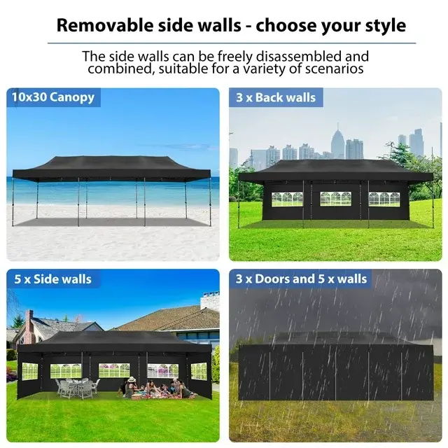 10x30 feet shade area ? Heavy-duty frame is strong and stable ? Pop-up design for quick installation ? 8 side walls in various shapes ? 3 height adjustments ? A full set of rich accessories ? Suitable for all seasons