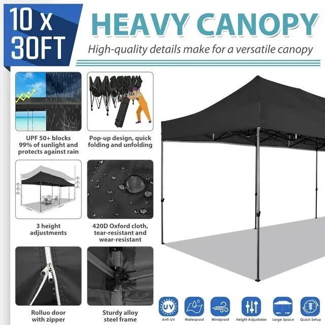 Our SANOPY heavy duty upgraded frame canopy tent features a commercial grade 10x30ft durable powder-coated stainless steel rustproof frame that is perfect for outdoor use. This canopy is a pop-up canopy, easy to set up, 2-4 people can complete the installation within half an hour, and the canopy comes with a 4-wheel rolling bag for easy transportation and storage of the tent. Boasting 1.26" pipe diameter, 0.03" wall thickness brackets and tent stability using the included sandbags, rope and pegs, this canopy can withstand up to Force 4 winds (18 mph). Moreover, our canopy is made of 420D waterproof and UV-resistant high-quality fabric, which is 100% waterproof and reflects 99% of harmful ultraviolet rays. 5 side walls with windows and 3 side walls with zippers, 3 adjustable heights, you can install and combine the canopy tent according to your needs, this heavy duty tent is perfect for yard parties, weddings, barbecues, camping, temporary parking , sports events, etc.