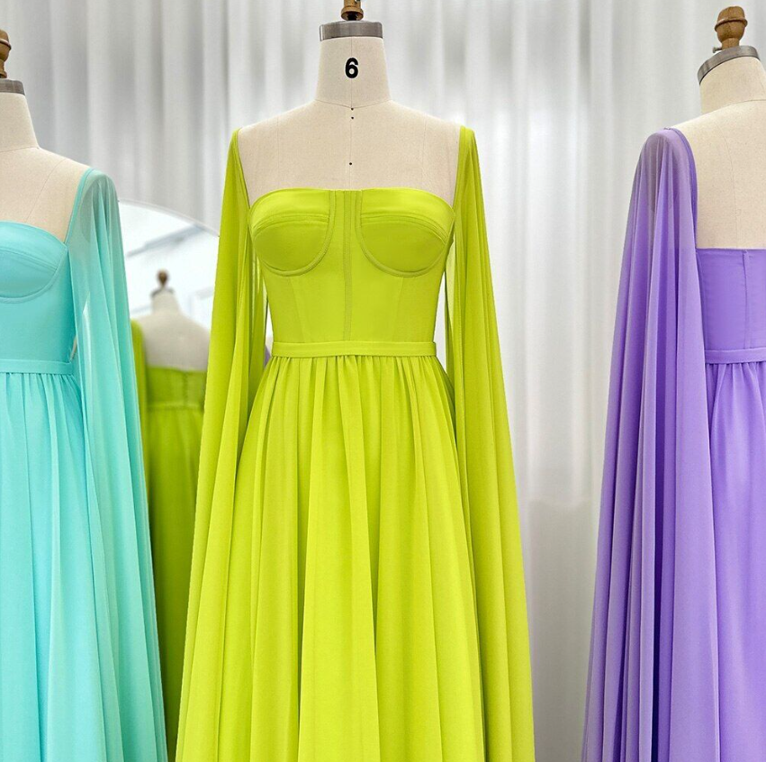 Saudi Arabic Lemon Yellow Dubai Evening Dresses Cape Sleeves Elegant Party Gowns