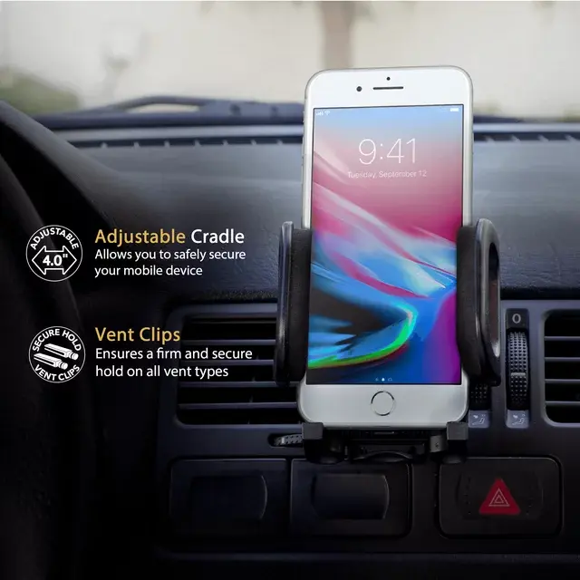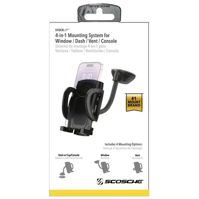 • 4-in-1 universal mount kit that can be used on your vehicles window, dash, vent, cup holder or any flat surface in the home of office