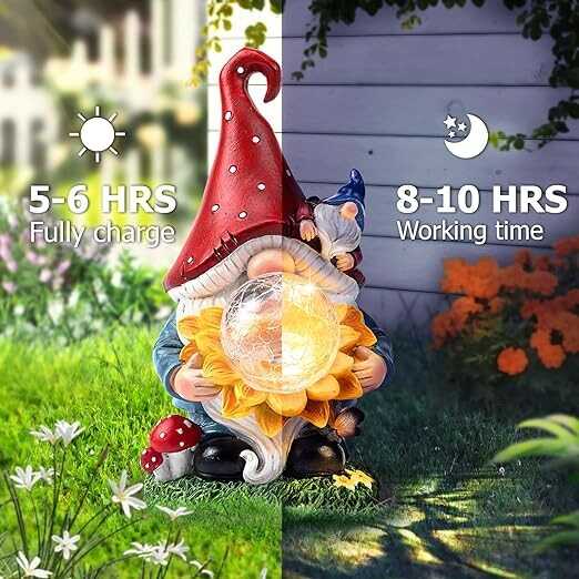 Gnome Statues Garden Decor: This delightful gnome, holding a sunflower and featuring a cracked glass ball emitting a warm glow, adds whimsy to your outdoor space. Meticulously sculpted and hand-painted, our solar garden statues is the perfect accent for a charming garden ambiance.