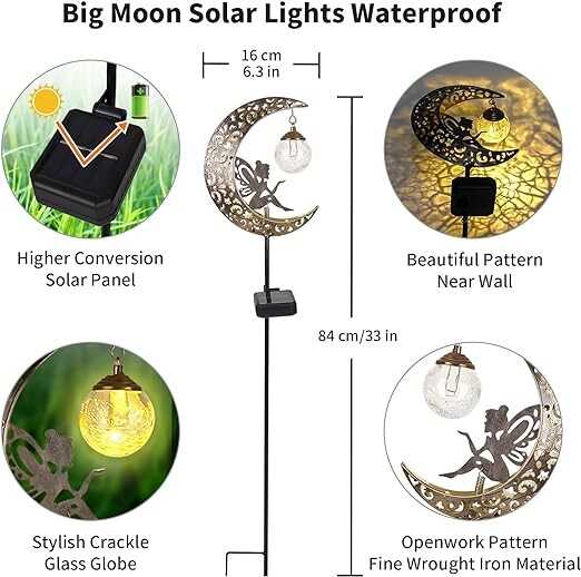 • 【Solar Moon Fairy Lights】Solar lights outdoor garden decor,These garden lights design with fairy moon, solar lights create a beautiful patterns when illuminated. Solar lights outdoor add attractive landscaping lighting for your lawn garden backyard or path, making your garden more beautiful and inviting.