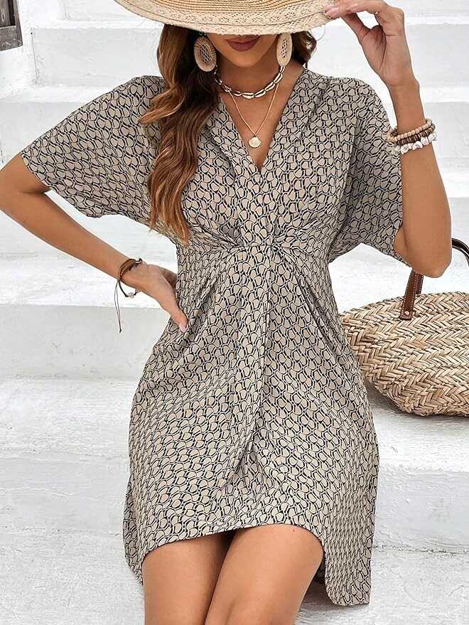 • Feature: all over print, twist, v neck, a line, high waist, short sleeve, flared hem, fashion short dresses for women