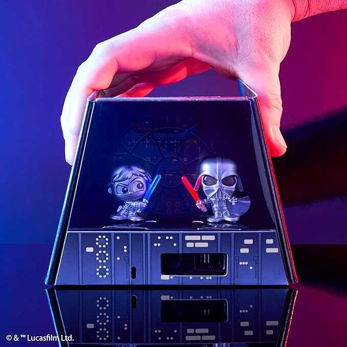 • Epic Design for Epic Battles: Luke Skywalker and Darth Vader mini figures are stylized with a shimmery metallic silver finish. They hold transparent Lightsabers that glow when the LED lights in the display are activated.
