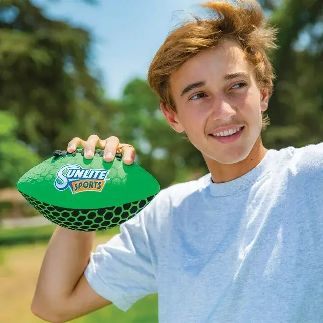 The Sunlite Sports Glow-Lite Football has the coolest design: glowing in the dark! While being played for an afternoon, this football will continue to glow for about half an hour after sunset. The silicone coating always makes for a comfortable and easy grip. This football is soft and safe. Kids and adults will both find joy and excitement from playing it! Invite your friends and family out to a field with our Glow-Lite Football!