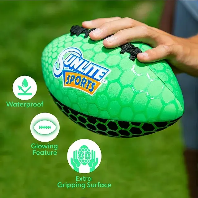 Sunlite Sports Football with Glowing Surface at Night, Waterproof, Outdoor Sports and Pool Toy, Beach Game, Neoprene, Green/Glowing, 9 inch