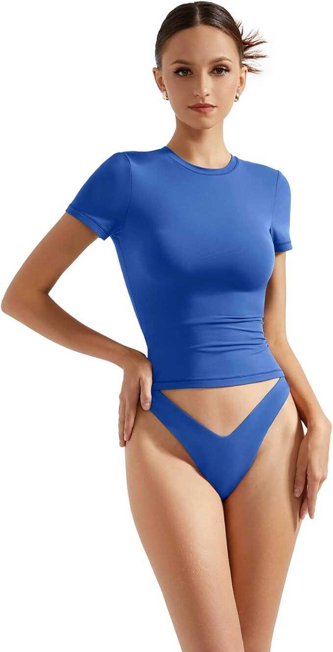 • Slimming Fitted Short Sleeve Basic Tees: Crew neck slim fit tops, Compression skin tight shirts, Short sleeve casual tops, Full length undersrubs