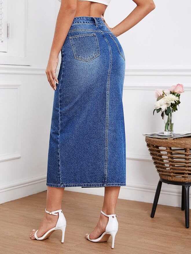 • High waisted, button and zipper fly, slit front, a line, midi denim skirt for women
