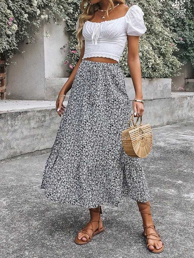 SweatyRocks Women's Casual High Waist Floral Print Skirt Split Thigh A Line Maxi Skirts