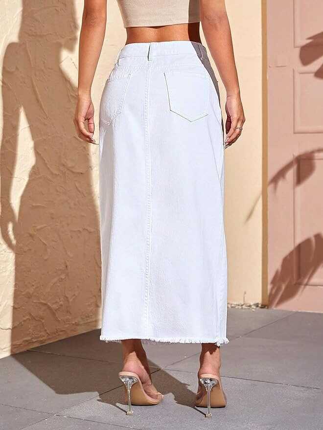 • Long jean skirt with pockets, features with high waist, slit thigh, raw hem, zipper fly, button front