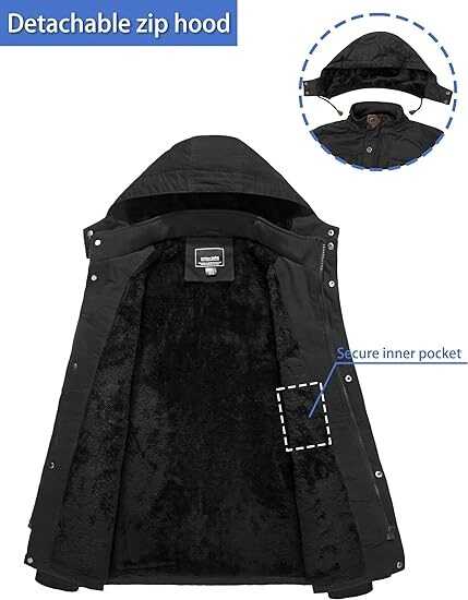 ¡¾Windproof¡¿Mens thick winter jackets with detachable zip hood, drawstring design, adjustable cuffs, button stand collar, and full zipper closure, all the well-designs keep out the wind effectively, and help seal in warmth.