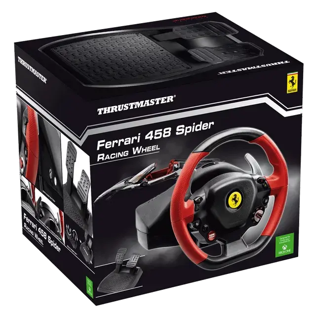 Race in style with this 7:10 replica of the Ferrari 458 Spider racing wheel. The realistic wheel has a bungee cord mechanism that keeps constant resistance regardless of turning angle, and the adjustable wheel sensitivity makes it easy to control your favorite game without difficulty.. Under official licenses by Ferrari & Microsoft Xbox One. Wide & adjustable optimized pedal set. 7:10 replica of the Ferrari 458 Spider racing wheel. Realistic 11" dia racing wheel. 2 up & down metal paddle shifters. 9 replica action buttons. 1 Manettino (2 positions). 1 Xbox guide button.