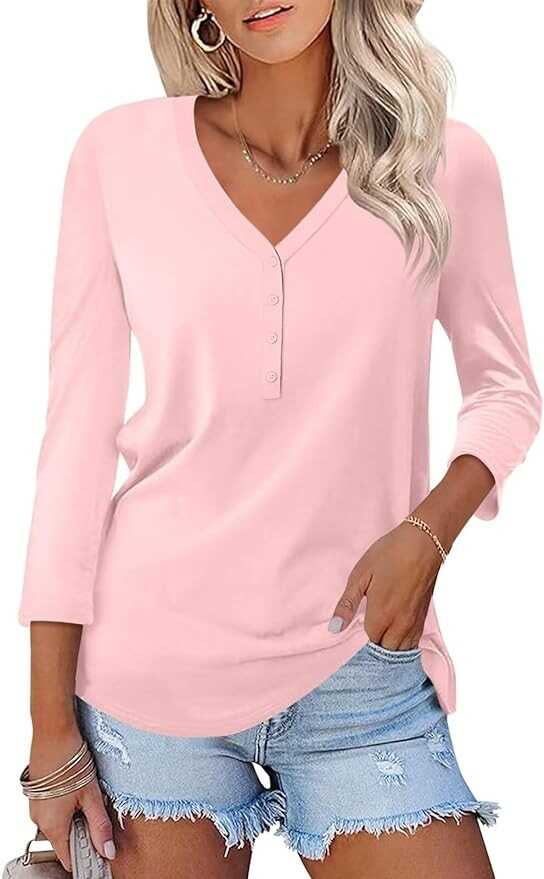 【Special Features】3/4 length sleeve womens tops, v neck t shirts, button up shirts, basic tunic tops, solid, casual and cute. V neckline lets your neck look more slender and graceful; 3/4 sleeve design is easy to modify your arm.