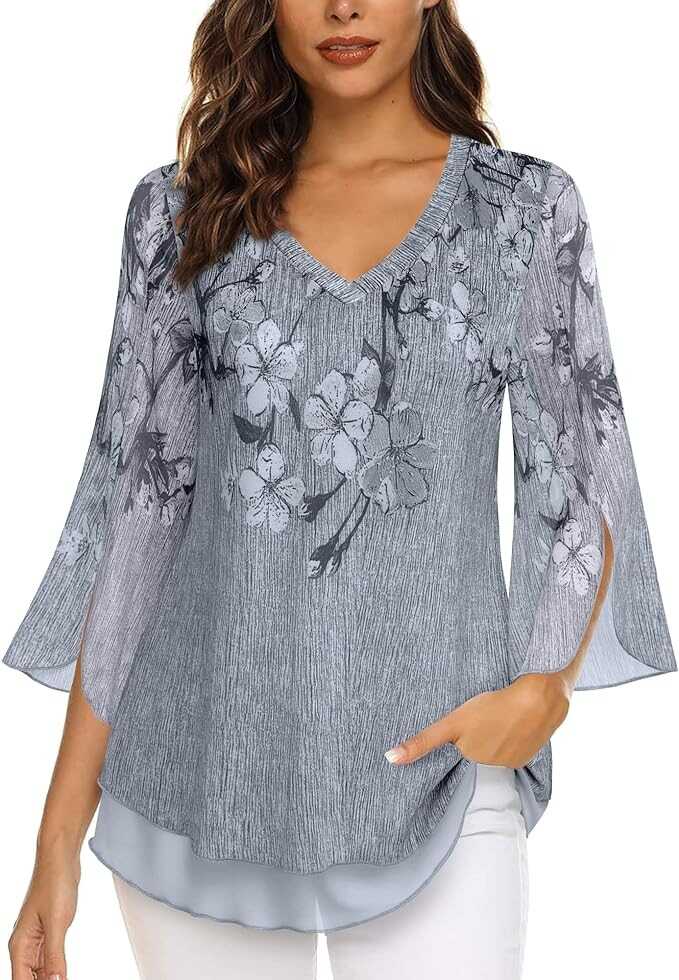 Timeson Women's 3/4 Sleeve Floral Blouses Shirts Double Layers V Neck Dressy Tunics Tops