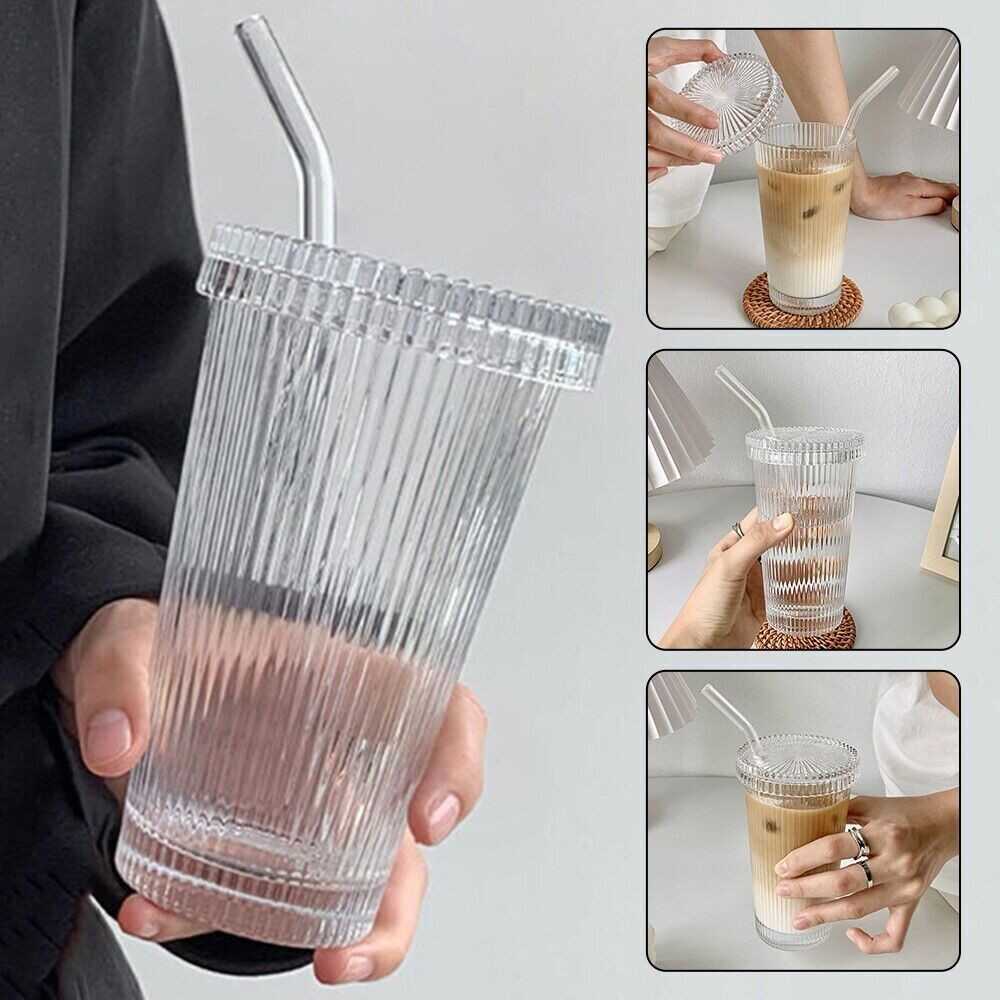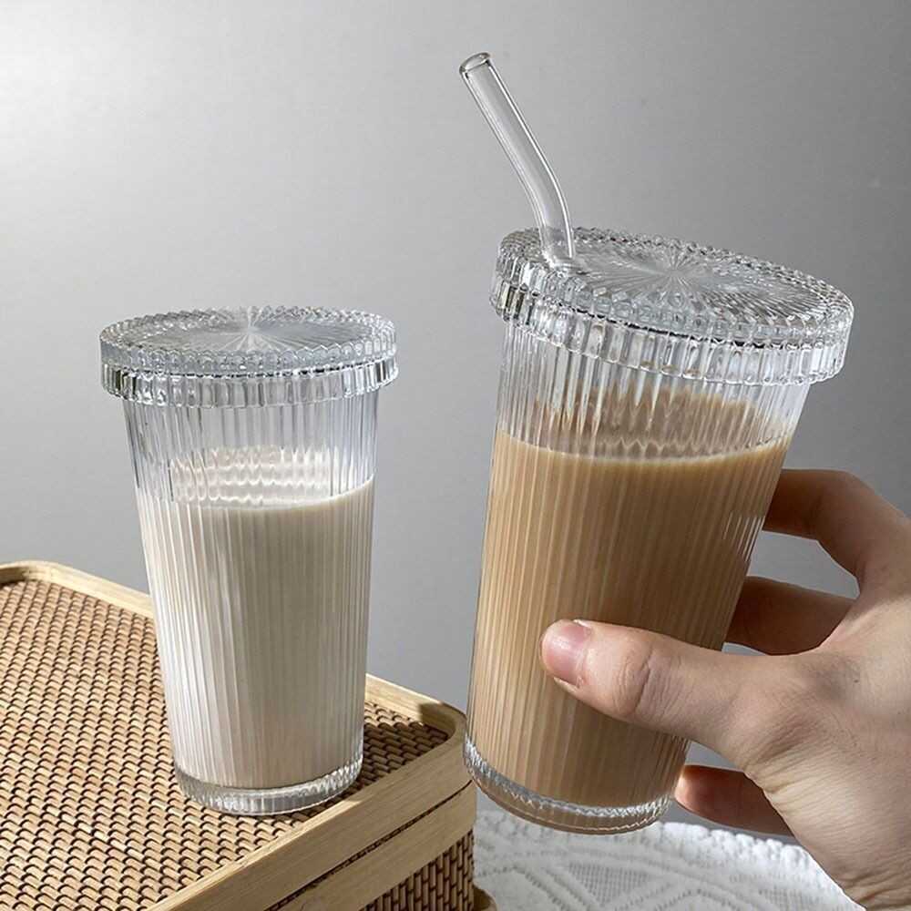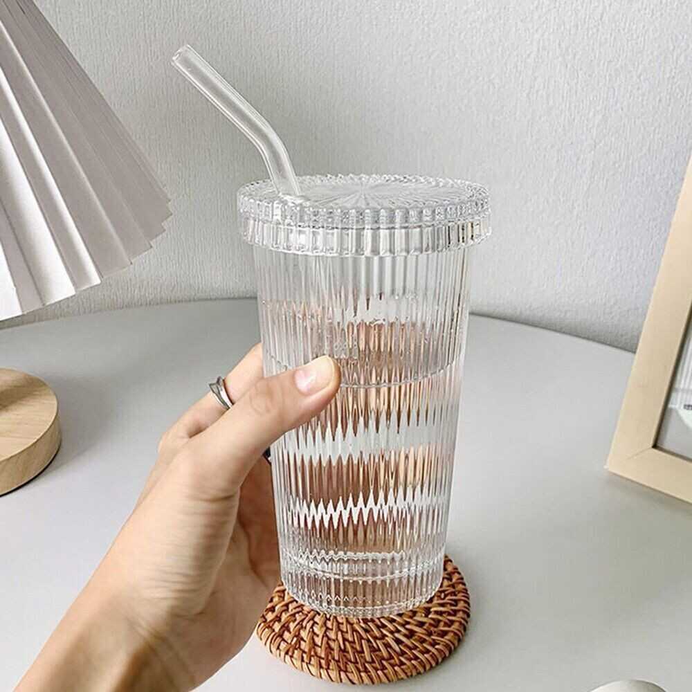 Transparent With Lid And Straw Mug Tea Cup Stripe Glass Cup Milk Coffee Mug