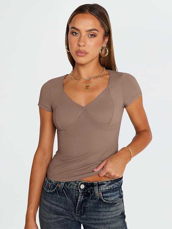 Trendy Queen Womens V Neck T-Shirts Going Out Tops Short Sleeve Slim Fit Basic Y2K Clothes 2024