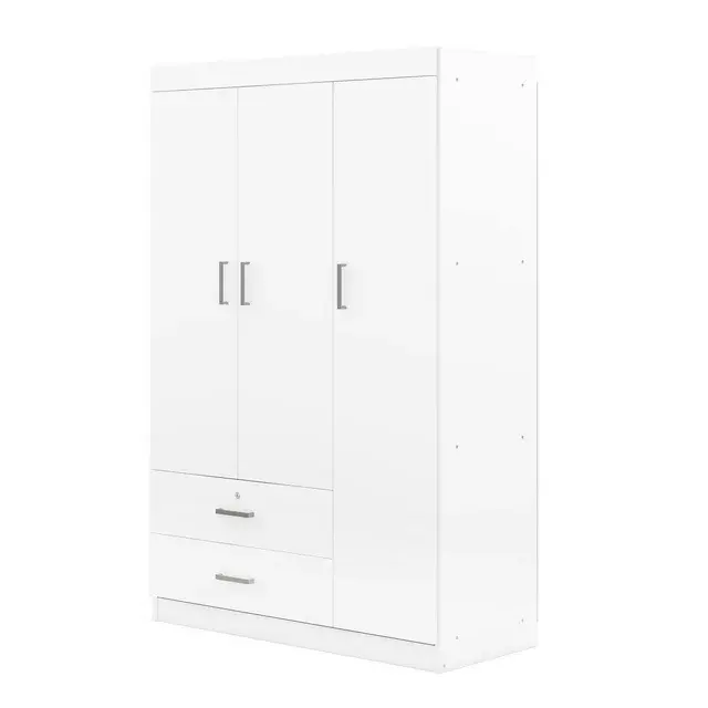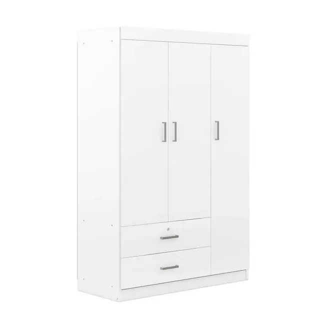 Modern 3-door bedroom wardrobe with drawer, shelves and hanging rail. Ideal for bedrooms with a modern decor theme. White will match most modern room decor themes according to most interior designers. The storage combination provided on this free-standing wardrobe will allow the user to maximise and organise all items without having to compromise on the look of their bedroom. Long modern black handles add quality to this wonderful wardrobe. Larger than most 4-door wardrobes yet small enough to fit into small bedrooms!
