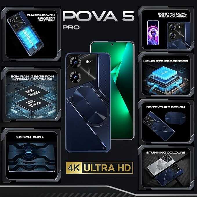 • Aesthetically, the POVA 5 Pro doesn't shy away from making a statement. Its unique 3D textured back design is not only a pleasure to hold but also sets you apart from the crowd, reflecting your individual style.