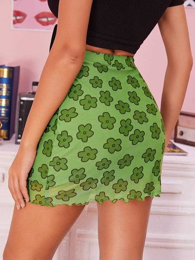 Verdusa Women's Floral Mesh Overlay Elastic Waist Bodycon Mini Skirt