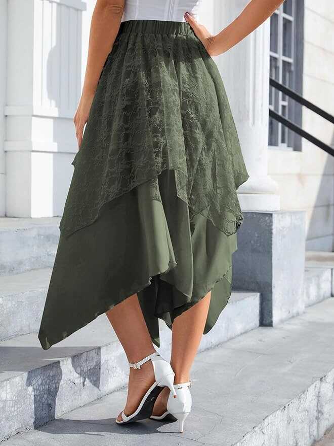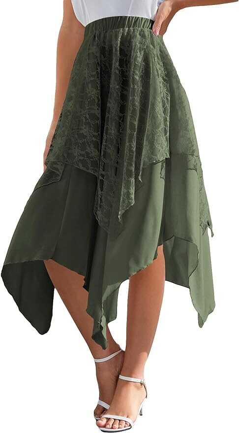 Verdusa Women's Lace Overlay Elastic Waist Asymmetrical High Low A Line Long Skirt