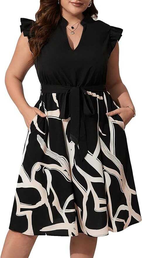 Verdusa Women's Plus Size Ruffle Cap Sleeve Notched Neck Belted A Line Flared Dress