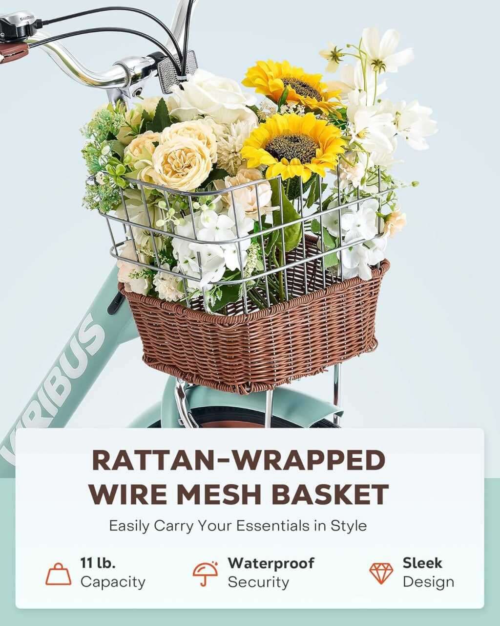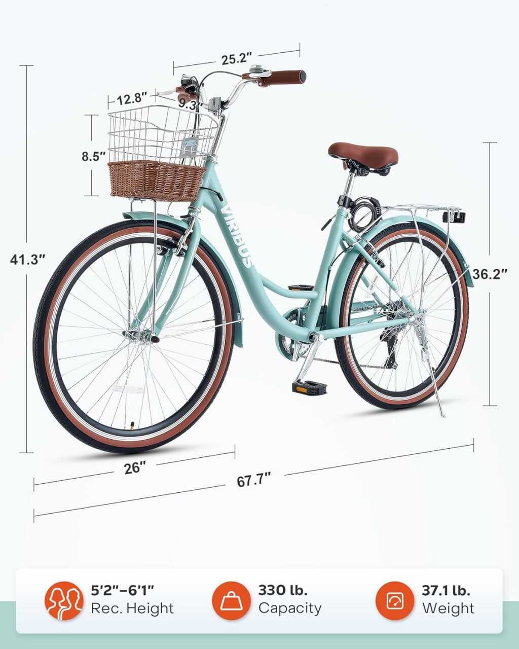 Front and Rear Storage: This beach cruiser bike for women features a stylish rattan front basket and a reinforced rear rack, enabling you to store groceries, carry essentials, or bring your furry companions along on your urban escapades