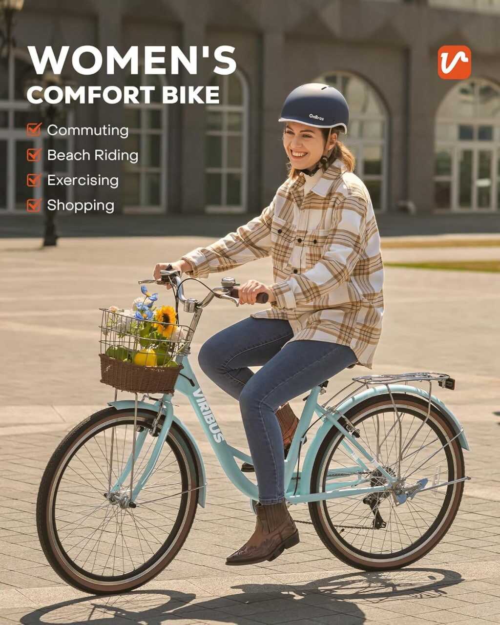 Viribus Womens Bike, 7 Speed Bike for Adults Women 24 26 inch with Ratten Basket & Rack, Beach Cruiser Bike for Women, Womens Bicycle for Commuting, Step Through City Bikes for Women Adults Ladies