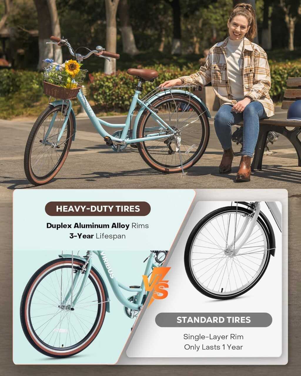 7 Speed Womens Bike: Equipped with a 7-speed derailleur and user-friendly thumb shifters, this cruiser bike ensures smooth and precise gear changes for stable rides on various terrains, from city streets to winding trails