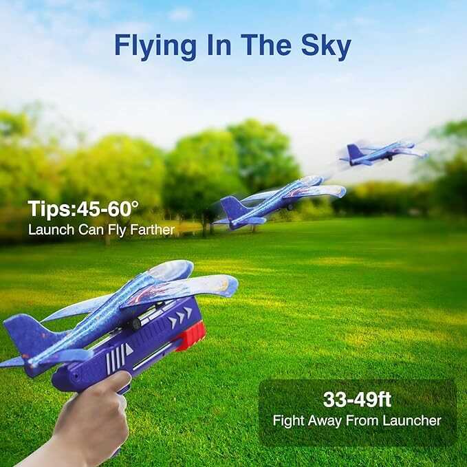 • 3 Pack Airplane Toy - Include 1× launcher, 3× airplanes, 3× beauty stickers, 1× instruction on Airplane installation itself and Airplane/Launchers installation. Our glider plane toy is equipped with 3 gliding foam planes of different colors, blue, orange and green. Kids Outdoor Toys Gifts for age 3-12 - Best Powerful Outdoor Flying Toy would be a great airplane toy for kids 3 4 5 6 7 8 9 10 11 12 years old. Made of environmental abs plastic and foam materials. High Quality and Durable.