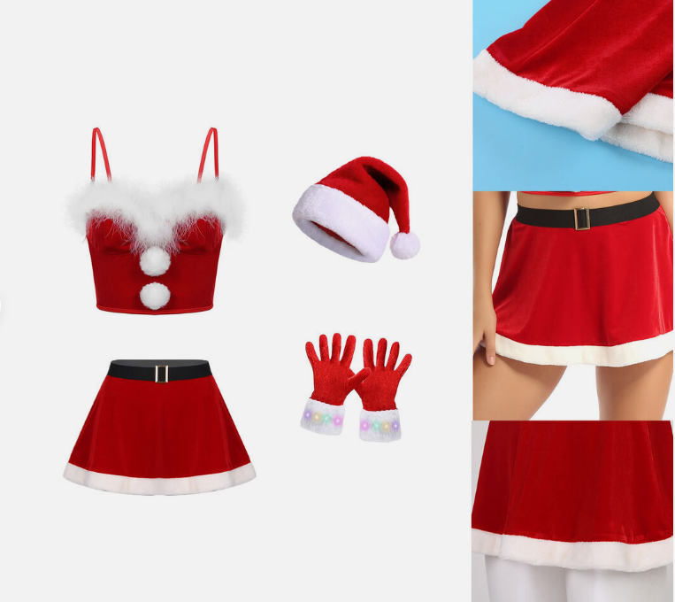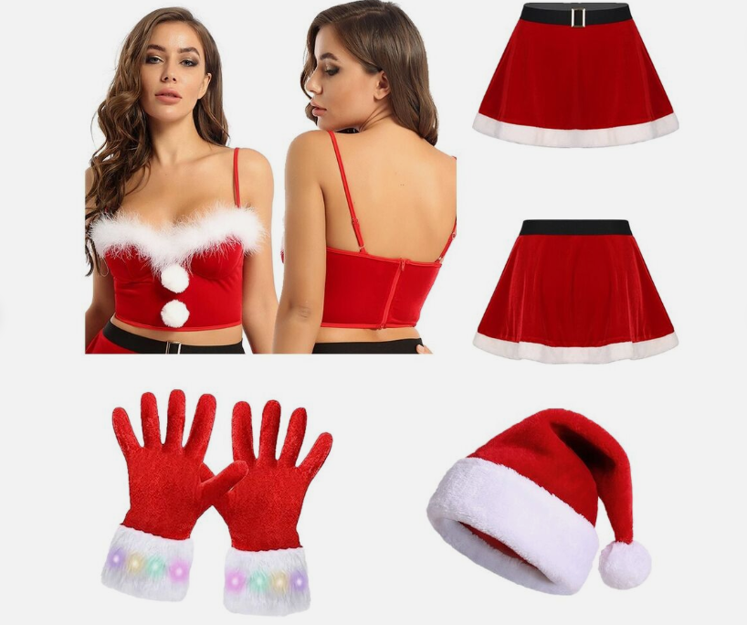 Woman's Crop Top with Skirts Christmas Costume Santa Hats and Gloves Fancy Dress