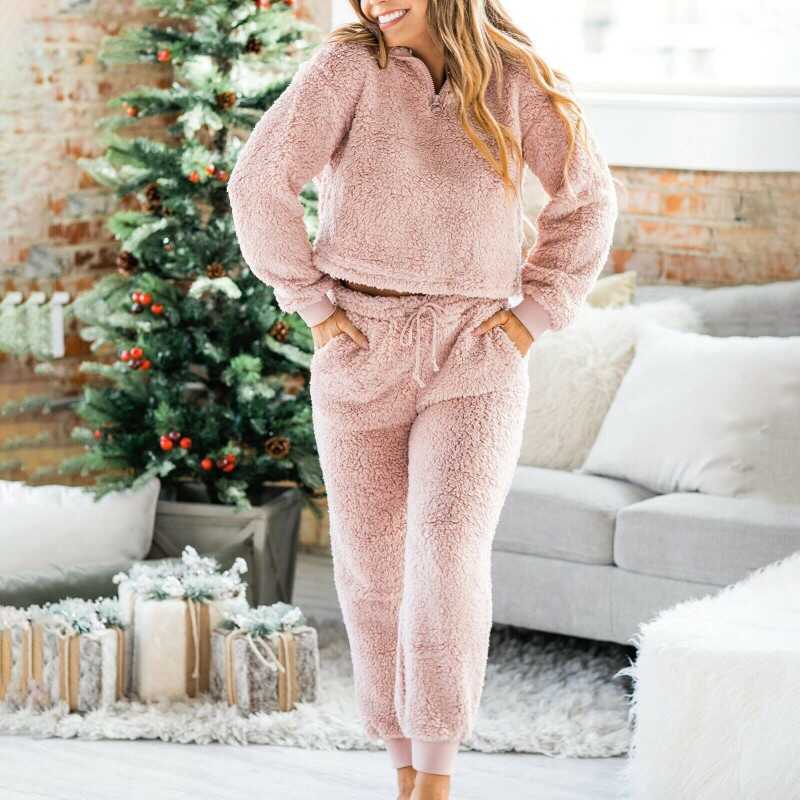 Women Pajamas Long Pants Teddy Bear Fleece Winter Soft Lounge Suit Sleepwear Set
