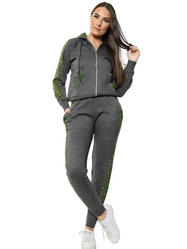 Fleece, Hooded, Floral Side Panel, Windproof, Elastic Waist, Comfort, Sports, Drawstring, Stretch, Thermal, Sport Suit, Moisture Wicking, Side Stripe, Pockets, Lightweight, Lounge Suit, Zipper, Jogging Pants