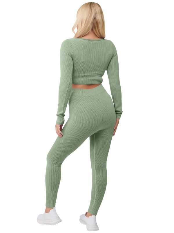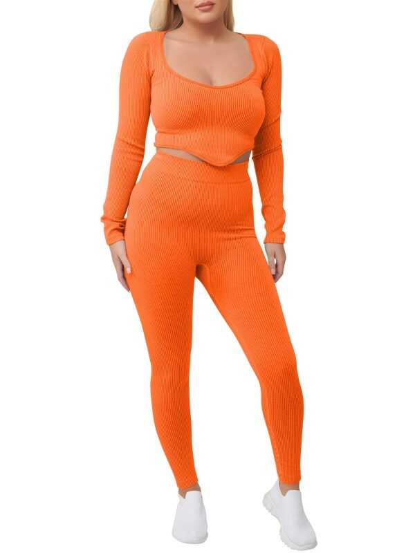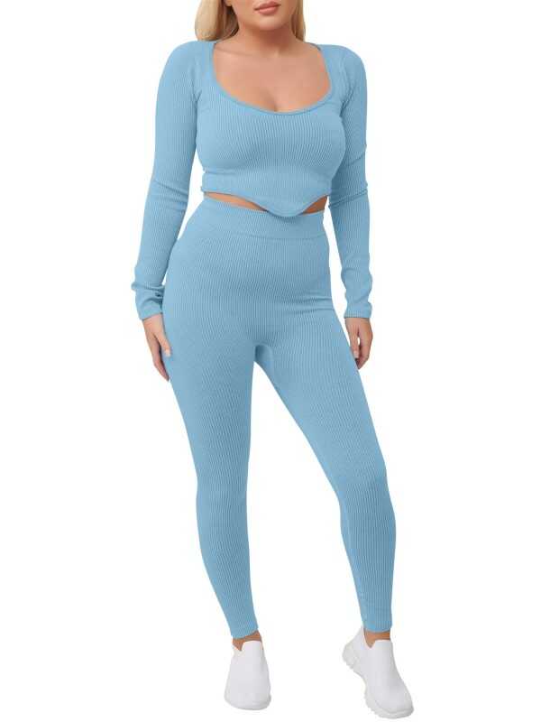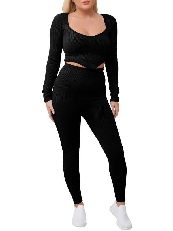Womens Plain Ribbed High Waist Seamless Stretch Tracksuit 2 Piece Ladies Gym Set