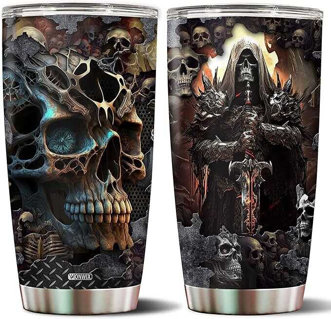 WONWIX Skull Tumbler, Birthday Gifts For Men Who Love Skulls Coffee Mug Cup Christmas Valentine Gift Water Bottle Black Tumblers 20oz Stainless Steel Travel Cups With Lid