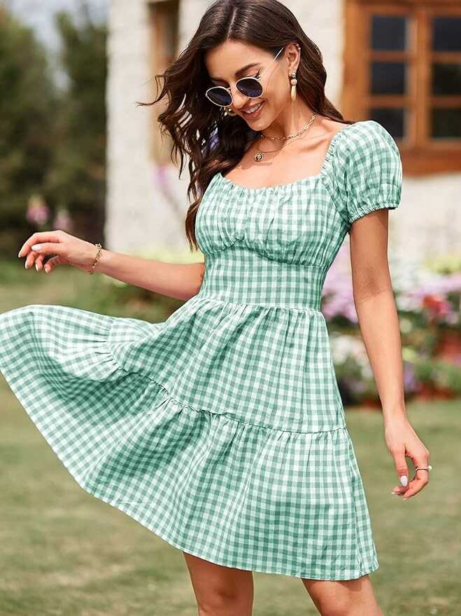 ▶Features:Womens casual mini dress with plaid pattern,crewneck ,short sleeve, cute puff sleeve,back zip up,flowy style,fashion above knee length summer short dress.