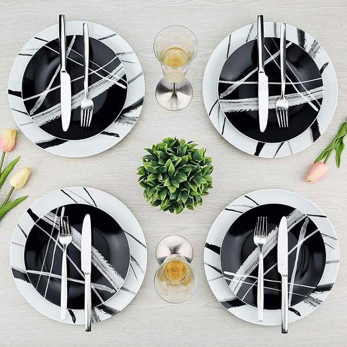 ZYAN 16 Piece Round Dinnerware Sets, Black and White Metro Stoneware Dish Sets, Dishwasher Safe Plates and Bowls Sets for 4
